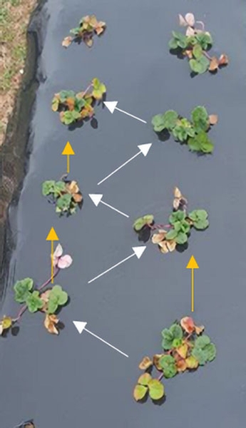Frost protection with overhead sprinklers requires maintaining a continuous water-ice interface and an undisturbed tissue-ice connection (Figure 3-10b, Figure 3-10c). Under those conditions, continuous freezing layer releases 80 calories of heat per 0.03 ounce of water. To achieve this, water needs to be supplied constantly starting at dusk until temperatures are high enough for the ice to thaw (Figure 3-10d). This will build up a layer of ice over the tissue. Constant application of water will keep the ice temperature around 31°F or 32°F, slightly above critical damage levels. Consistent droplet size and water coverage is important to provide protection from frost injury. The water-ice layer should be clear at all times, and water droplets should be running off (“running nose”) at all times. Ice layers that become cloudy or that do not show consistent water run-off will damage plant and blossom tissue.