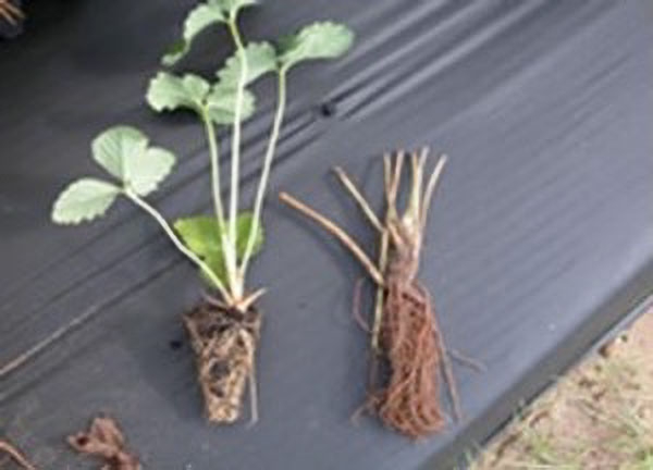 Bare-root plants, cut-off plants, and fresh dugs. These are plants that were grown in an open field nursery (usually in Canada or California), removed from the field, and shipped to the grower within a few days. Those plants can be stored in refrigerated environments for about a week after the initial dug date before losing quality. A high-quality bare-root plant consists of a single crown of about one half to one inch in diameter with a fibrous and dense root system. Cut-off plants have no leaves attached. Those plants are typically cheaper than plug plants and are easier to ship but more difficult to establish. Overhead irrigation for seven to 10 days after planting will have to be applied to initiate plant establishment. It is recommended that those plants are planted one week before the recommended plug plant planting date. A large problem with planting bare-root plants of any type is “J-rooting.” This happens when plants are inserted into planting holes that are too small. Cut-off plants are especially more sensitive to planting conditions, including planting depth and temperature. It is not recommended for beginners to use a large acreage of cut-off plants. Freshly dug bare-roots and cut-offs are usually delivered in crates of approximately 1,000 plants, which should be kept cold (between 35°F and 40°F) prior to planting. Plants should only be held for a few days before planting.