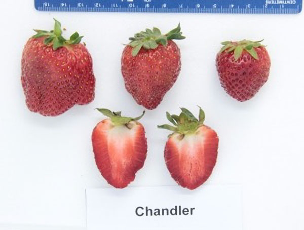 Mid-season. Medium-to-small-size fruit, moderate-to-high yield that has steady production through the season (Figure 2-3). Good flavor. Fruit can be very soft. Fruit size can be inconsistent. Not rain tolerant. Best for pick-your-own and other direct-to-consumer sales. Chandler is adaptable to many regions. Widely planted in the Southeast.