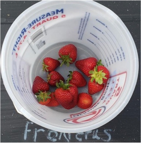 Mid-season. Medium-to-large size, moderate yield in spring (Figure 2-9a and Figure 2-9b). Good to very good flavor. Good for low tunnel, high tunnel, and greenhouse operations. Good for direct-to-consumer sales and wholesale markets. Plants need more nitrogen than standard recommendations. Attracts two-spotted spider mites. Not tolerant to rain.