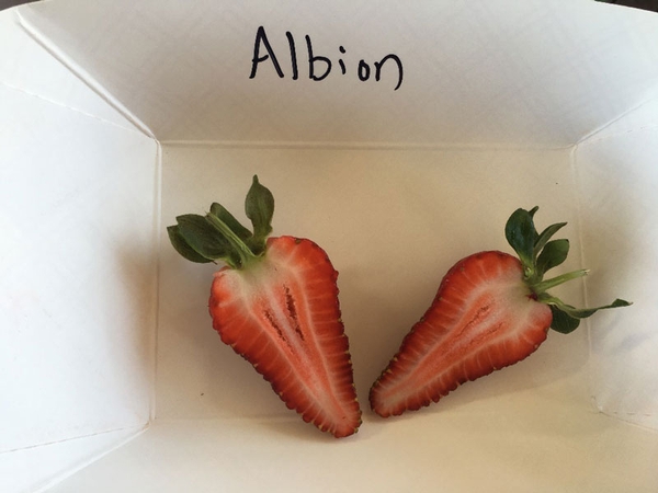 Medium-large berry, and higher yield than Albion. Fair flavor and firm. Good for low tunnel and high tunnel production. Good for direct-to-consumer sales and wholesale. Plants need more nitrogen during spring than is the standard recommendation. Not tolerant to rain.
