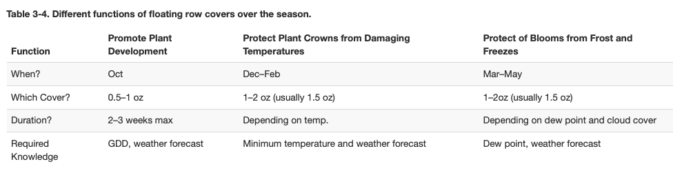A floating row cover under low wind speeds can be used to protect from frost, frost-freeze, and windborne freeze events (Table 3-4, Figure 3-10a). However, there are several limitations to row cover use. Floating row covers in the field are often very labor intensive to deploy (it takes two or three people for a 200-by-60-foot row cover). Row cover use can promote disease and pest development, and additional disease and pest management (such as for mites or grey mold) is often needed. Most importantly, floating row covers can cause damage if not used correctly. For example, row covers deployed during wind gusts of 15 mph or more can cause physical damage to blossoms and strawberry plant tissue. Wet row covers (due to previous rain) have no insulation value and can even freeze directly to the plants, which risks additional damage to strawberry blossoms and plants. However, floating row covers are the main management tool for frost and freeze protection, and if deployed under the correct conditions, can provide important crop protection. A 1.5-ounce row cover can potentially protect open blooms down to a temperature of 24°F at the canopy level.